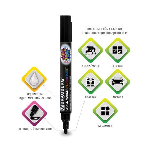 Маркер меловой "POP-ART" ЧЕРНЫЙ, 5 мм, стираемый, для гладких поверхностей, BRAUBERG, 151534