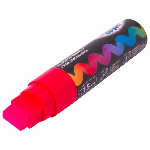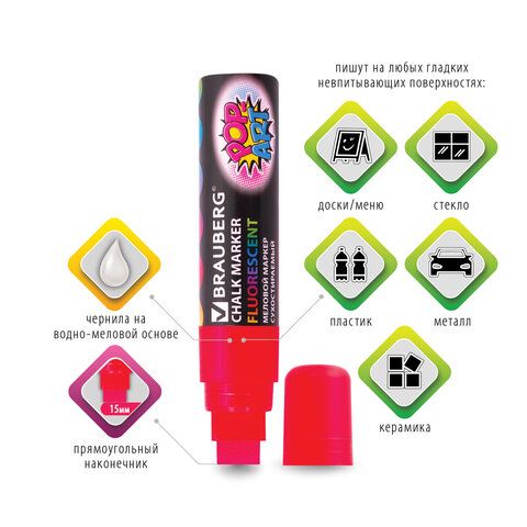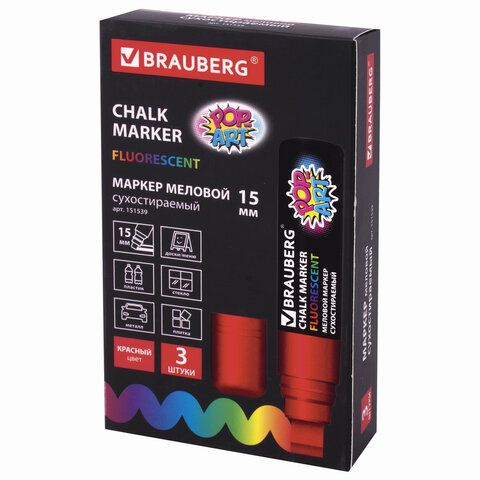 Маркер меловой "POP-ART" КРАСНЫЙ, 15 мм, стираемый, для гладких поверхностей, BRAUBERG, 151539