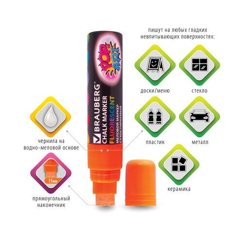 Маркер меловой "POP-ART" ОРАНЖЕВЫЙ, 15 мм, стираемый, для гладких поверхностей, BRAUBERG, 151541