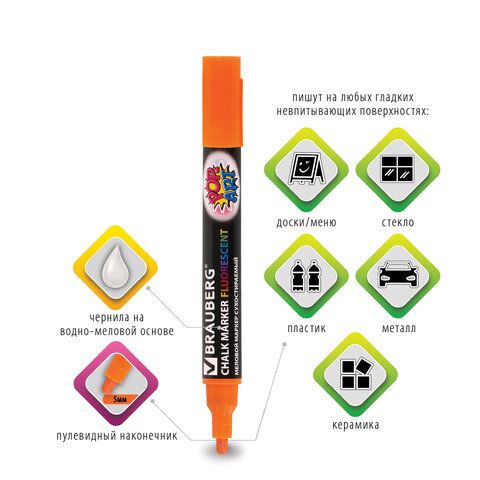 Маркер меловой "POP-ART" ОРАНЖЕВЫЙ, 5 мм, стираемый, для гладких поверхностей, BRAUBERG, 151531