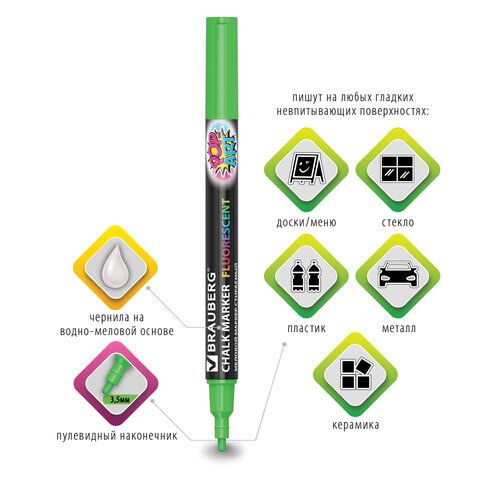 Маркер меловой "POP-ART" ЗЕЛЕНЫЙ, 3,5 мм, стираемый, для гладких поверхностей, BRAUBERG, 151524