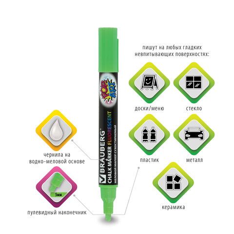Маркер меловой "POP-ART" ЗЕЛЕНЫЙ, 5 мм, стираемый, для гладких поверхностей, BRAUBERG, 151532