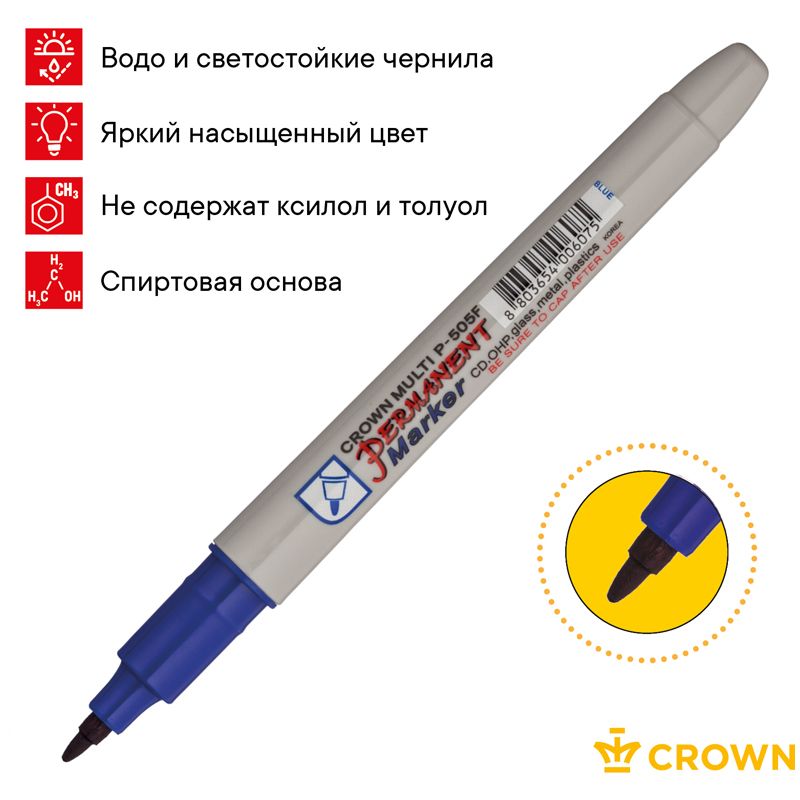 Маркер перманентный Crown "Multi Marker Super Slim" синий, пулевидный, 1мм