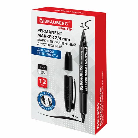 Маркер перманентный двусторонний BRAUBERG, ЧЕРНЫЙ, круглый наконечник, 2/4 мм, 150836