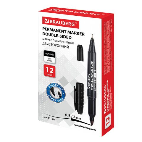 Маркер перманентный двусторонний BRAUBERG "Double", ЧЕРНЫЙ, наконечники 0,8/3 мм, 151635