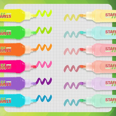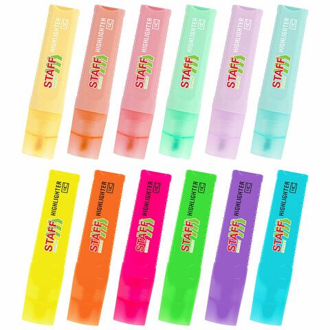 Набор текстовыделителей 12 ЦВЕТОВ, STAFF EVERYDAY HL-707, 6 неоновых цветов + 6 пастельных цветов, линия 1-5 мм, скошен. наконечник, 152552