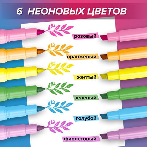 Набор текстовыделителей двусторонних 6 НЕОНОВЫХ ЦВЕТОВ, BRAUBERG "TWIN NEON", линия 1-5 мм, 152517