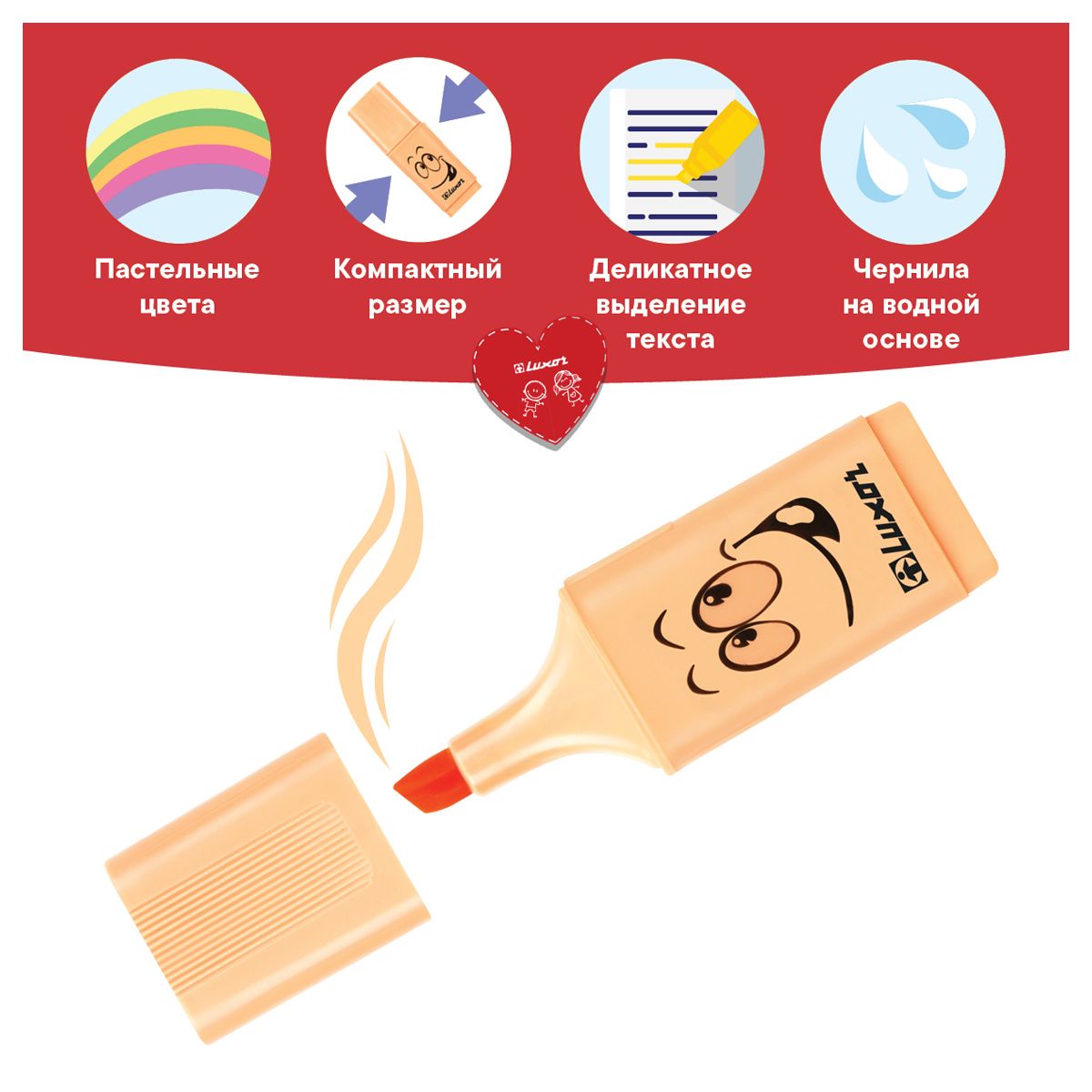 Текстовыделитель Luxor Eyeliter Pastel на водной основе представлен со скошенным пишущим узлом. Компактный размер 24*14,7 мм идеально подходит для пенала или сумочки. Пастельные чернила уменьшают нагрузку на зрение, не затемняют текст и подходят для выделения, эскизов, надписей. Текстовыделители нежно выделяют, быстро сохнут и не оставляют разводов и имеют привлекательный дизайн.