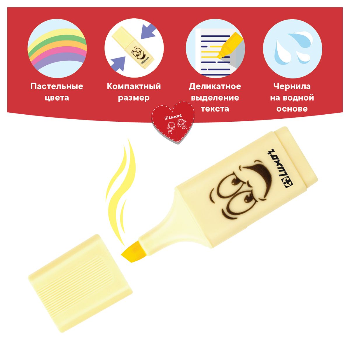 Текстовыделитель Luxor Eyeliter Pastel на водной основе представлен со скошенным пишущим узлом. Компактный размер 24*14,7 мм идеально подходит для пенала или сумочки. Пастельные чернила уменьшают нагрузку на зрение, не затемняют текст и подходят для выделения, эскизов, надписей. Текстовыделители нежно выделяют, быстро сохнут и не оставляют разводов и имеют привлекательный дизайн.