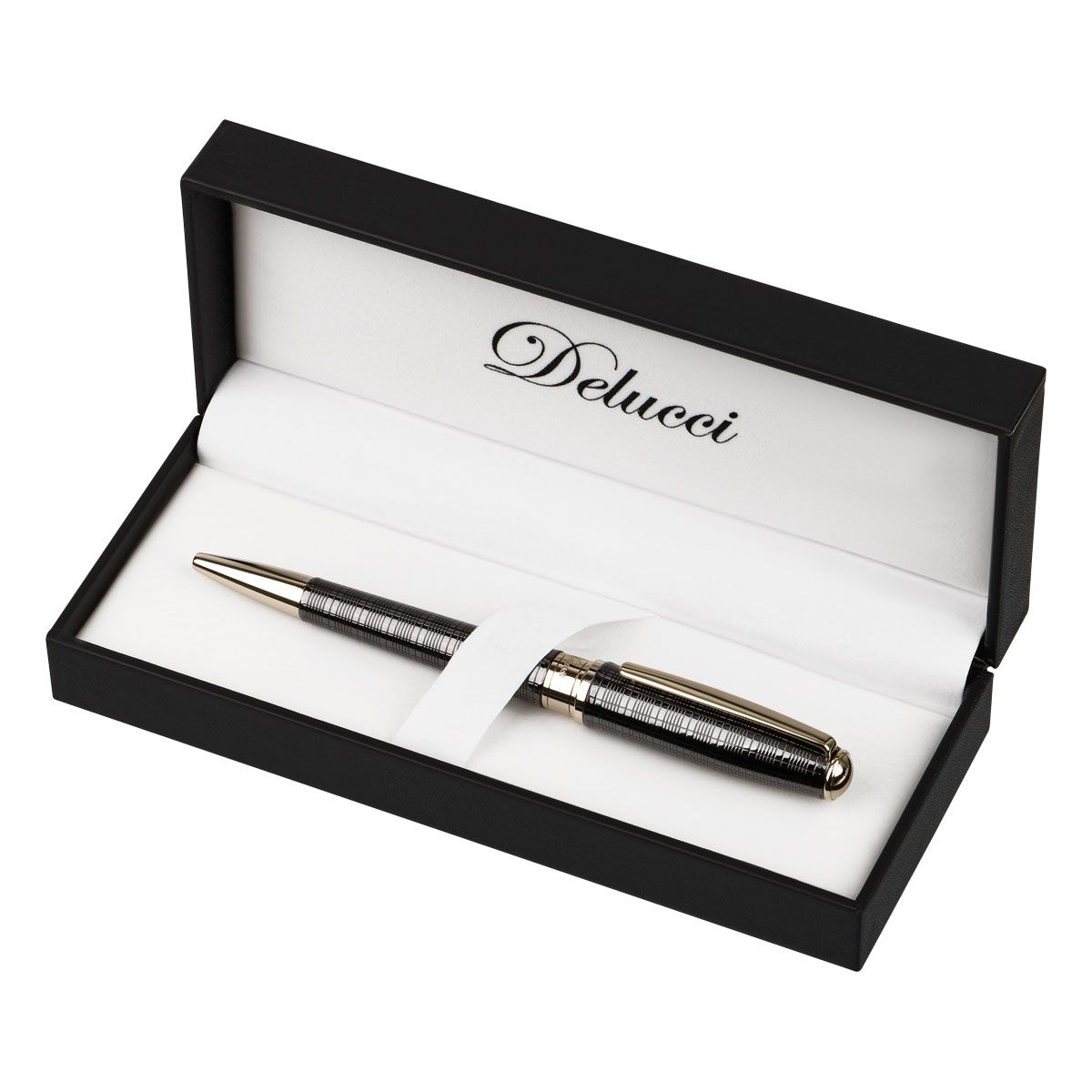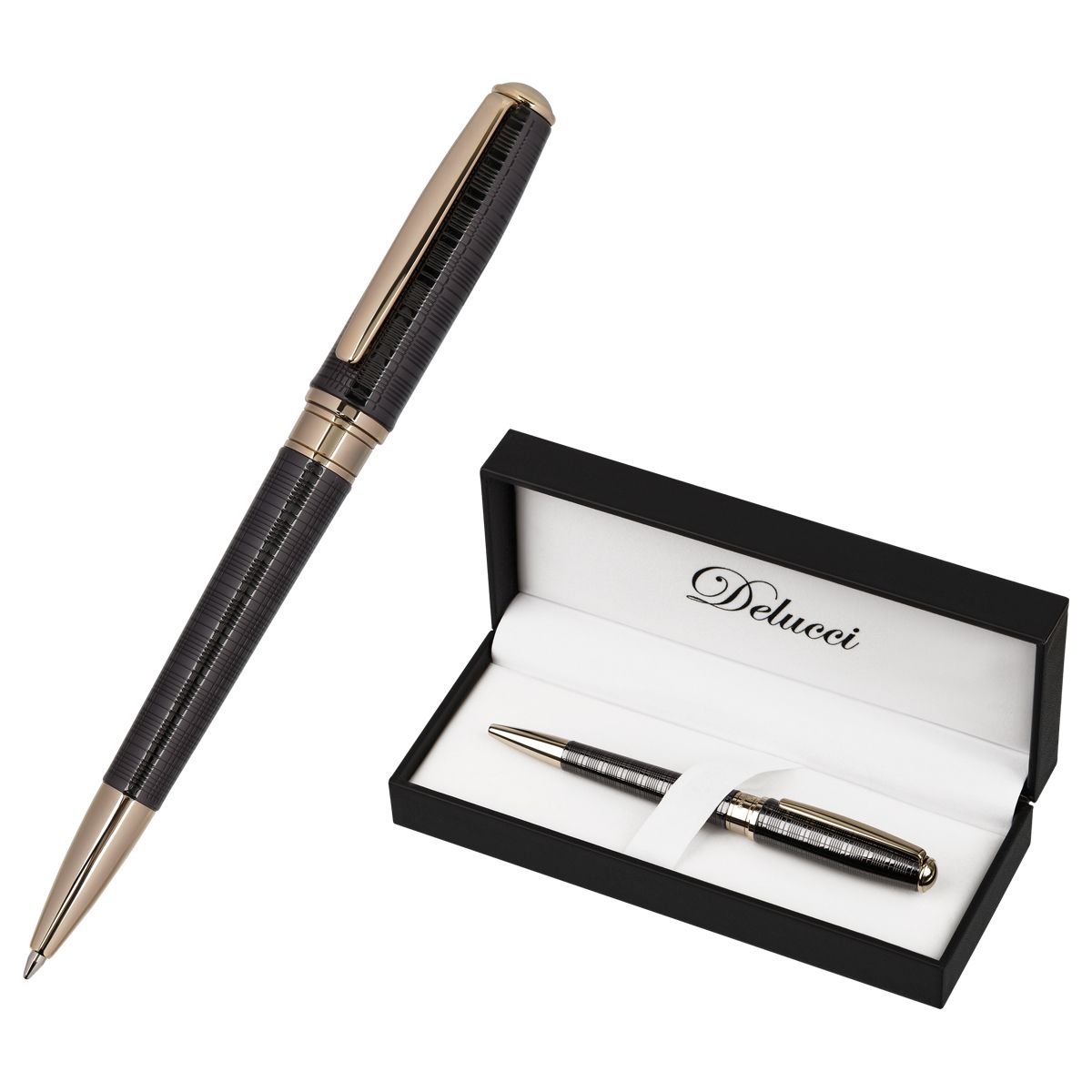 Ручка шариковая Delucci "Vestito" синяя, 1,0мм, корпус черный лак/золото, поворотн., подарочная упаковка