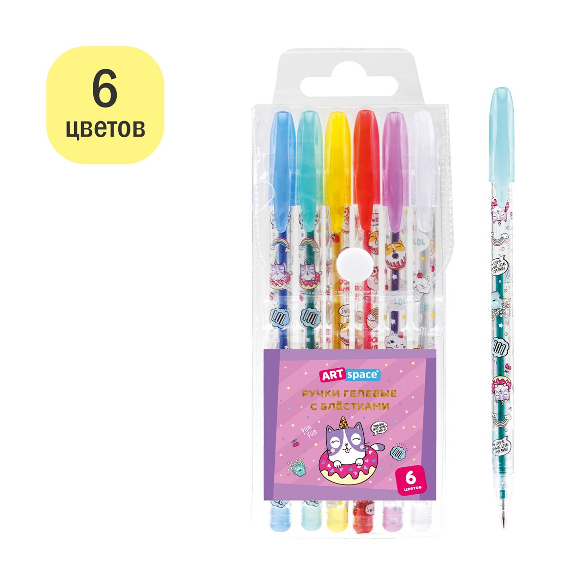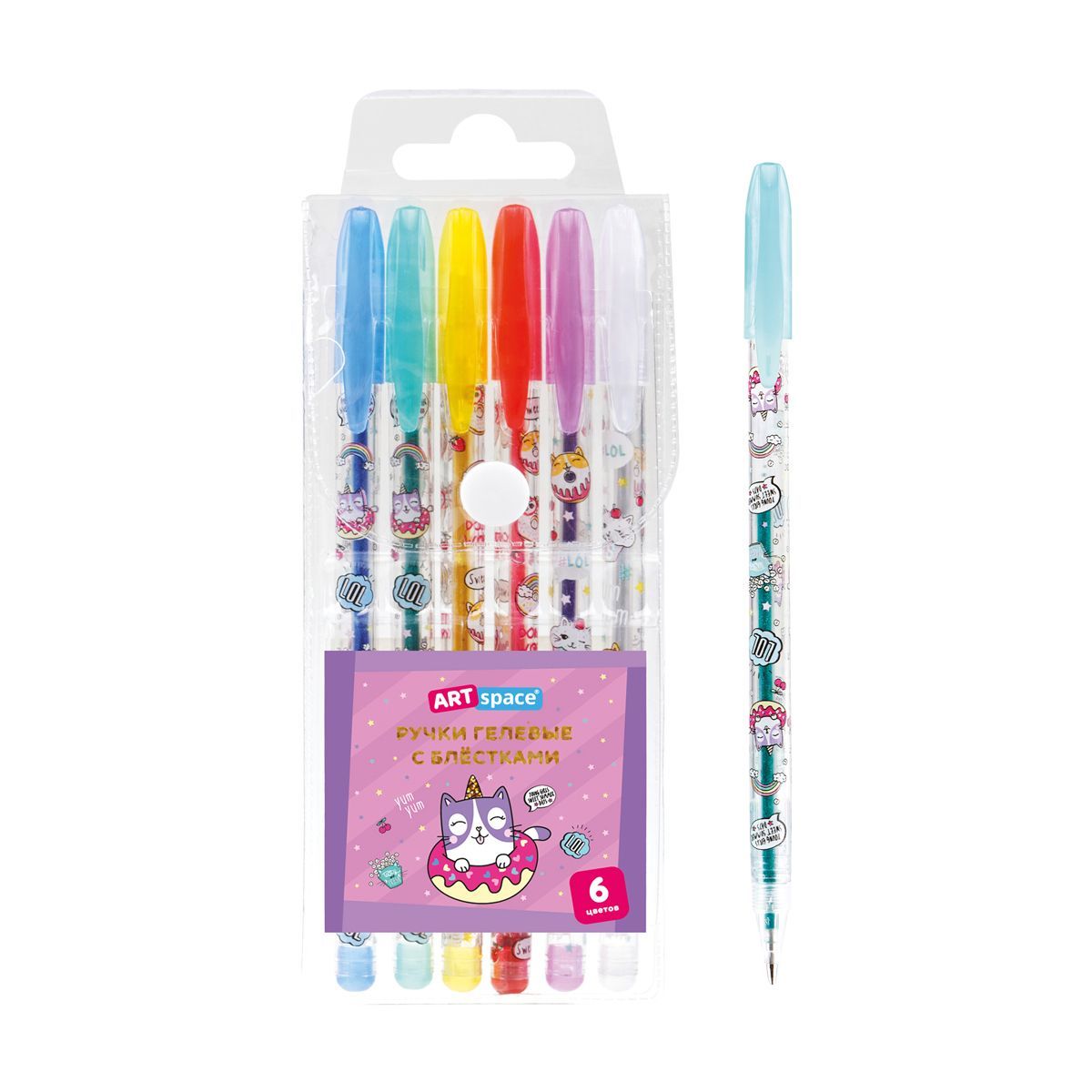 Набор гелевых ручек ArtSpace "Кот-сластена" 06цв., 1,0мм, с блестками, ПВХ чехол