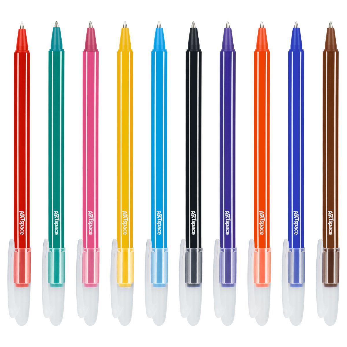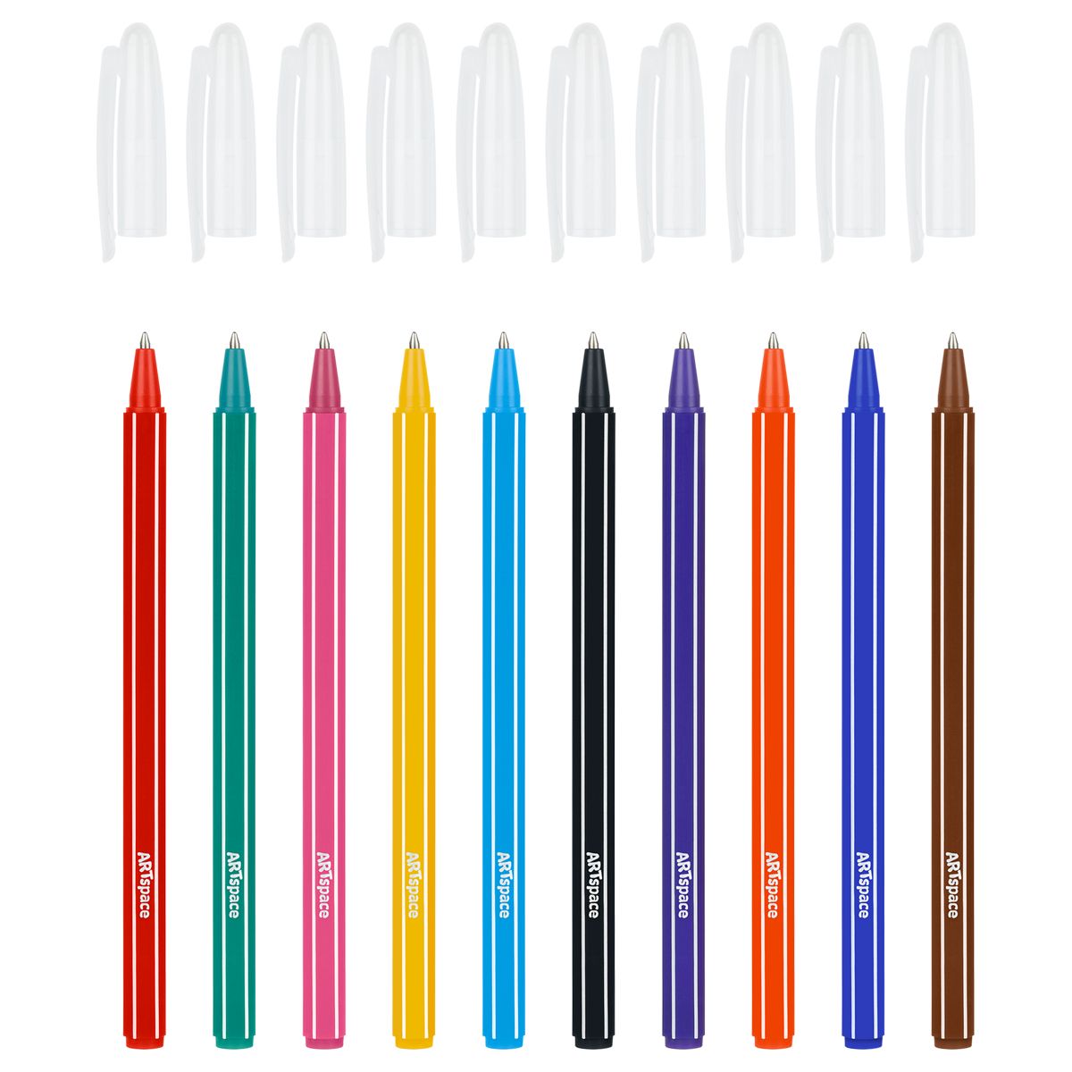На каждой ручке есть колпачок с клипом – можно закрепить её на одежде или тетради. Цвет чернил – ассорти. Цвет деталей корпуса соответствует цвету чернил. Набор упакован в ПВХ чехол с европодвесом.