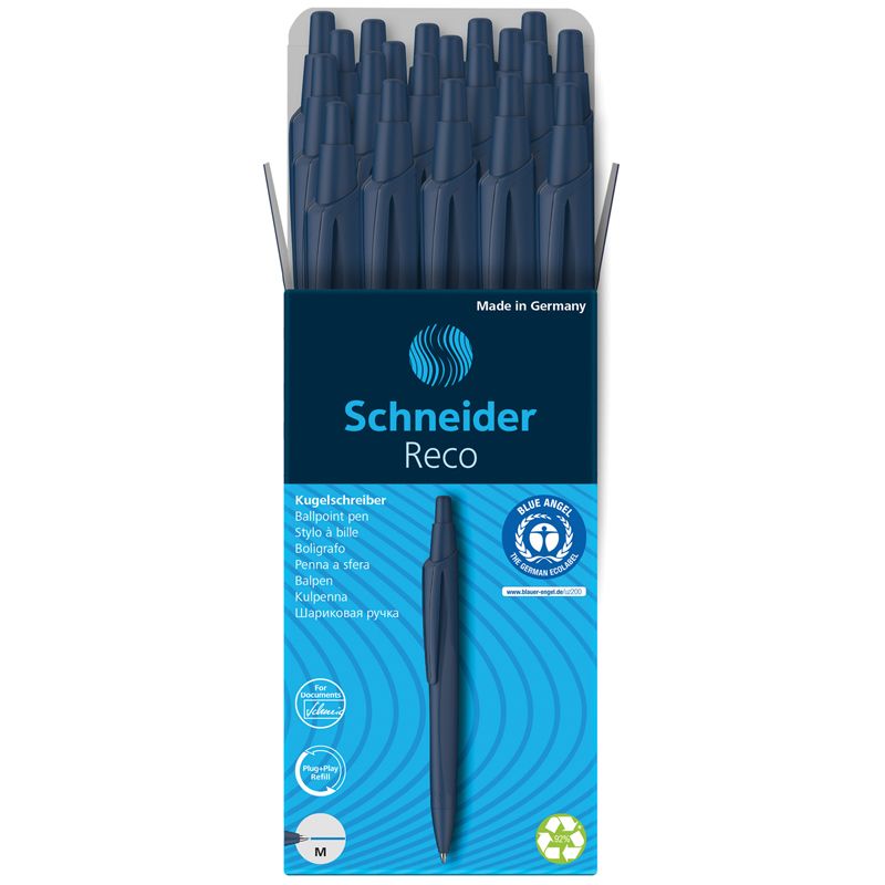 Автоматическая шариковая ручка Reco отмечена экологическим знаком Blue Angel. Быстросохнущие, свето- и водоустойчивые чернила соответствуют международному стандарту качества ISO 12757-2 и отлично подходят для заполнения и подписи документов. Длина непрерывной линии - до 4 000 метров.
