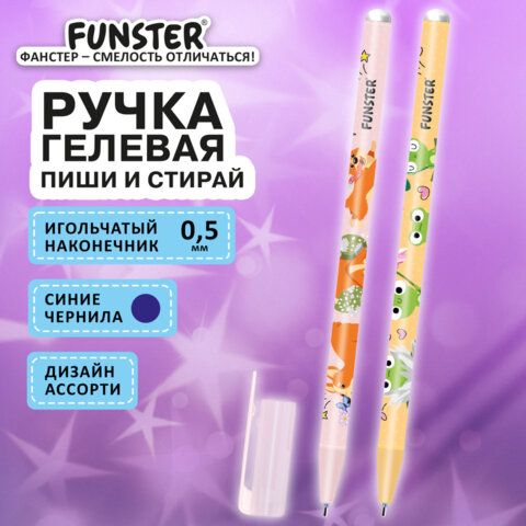 Ручка стираемая гелевая с принтом FUNSTER "CUTE ANIMALS", СИНЯЯ, корпус ассорти, игольчатый наконечник 0,5 мм, линия 0,35 мм, 144410