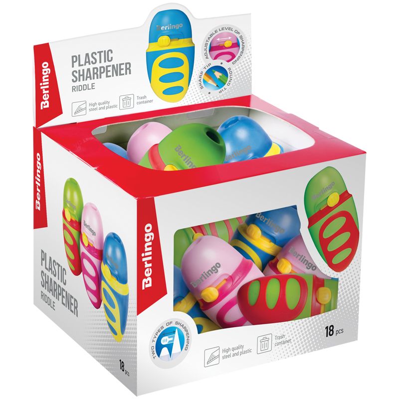 Точилка пластиковая Berlingo "Riddle" 1 отверстие, контейнер, c регулятором заточки грифеля, ассорти