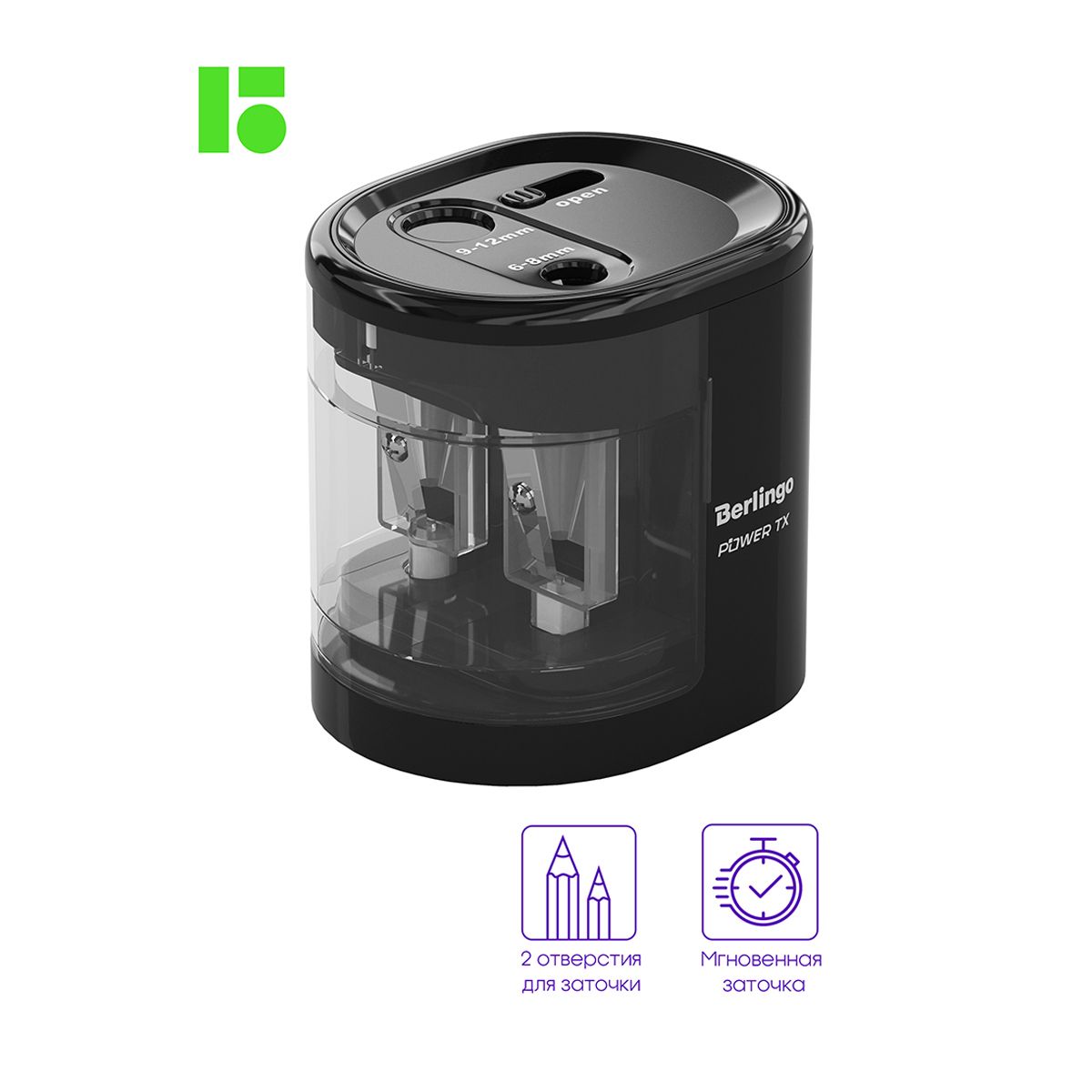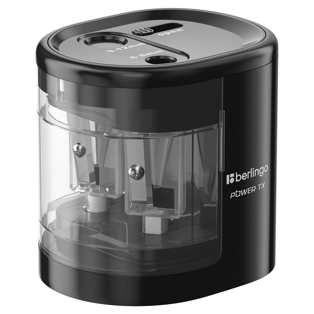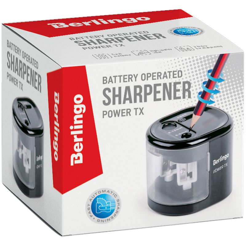Точилка электрическая Berlingo "Power TX" 2 отверстия, черная, с контейнером, картон. упаковка