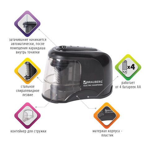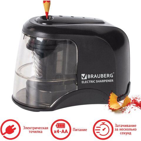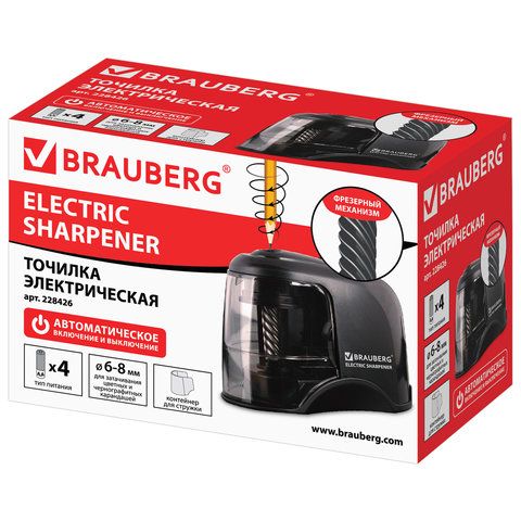 Точилка электрическая BRAUBERG "JET", питание от 4 батареек АА, спиралевидное лезвие, 228426
