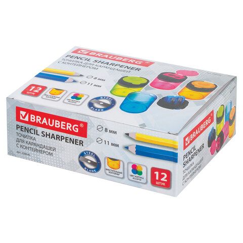Точилка BRAUBERG "Office Round", 2 отверстия для чернографитных карандашей (в том числе утолщенных), с контейнером, ассорти, 228446