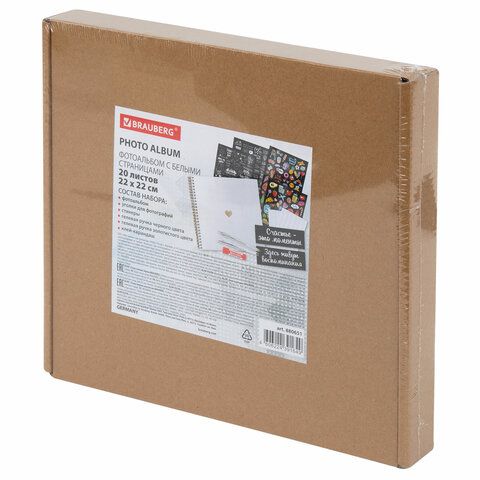 Фотоальбом 22х22 см, 20 белых листов, уголки, стикеры, ручки, клей, BRAUBERG White Line, 880651