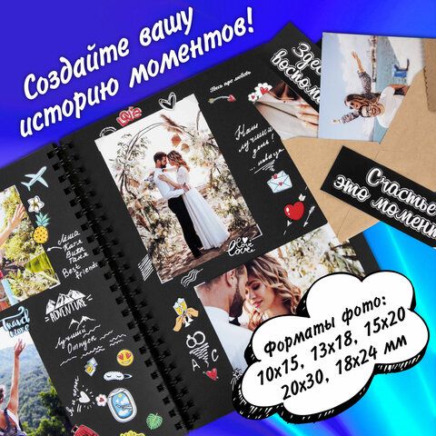 Фотоальбом 22х30 см, 24 черных листа, уголки, стикеры, ручка, клей, BRAUBERG "Black Line", 391310