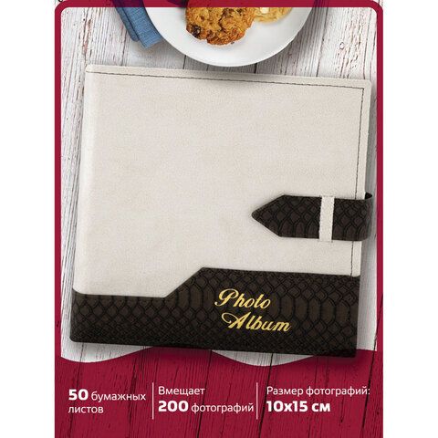 Фотоальбом BRAUBERG на 200 фотографий 10х15 см, под замшу, бумажные страницы, бокс, беж с коричневым, 390679