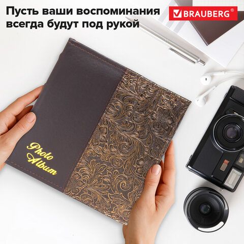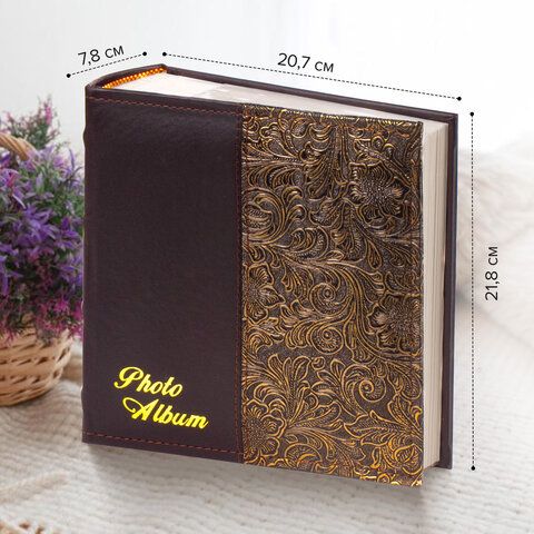 Фотоальбом BRAUBERG на 300 фото 10х15 см, под кожу, бумажные страницы, бокс, коричневый + золото, 391118