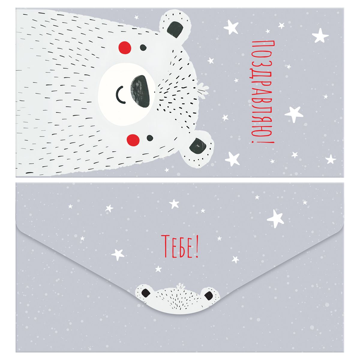 Размер конверта — 85*164 мм. Он сделан из плотного картона с глянцевой ламинацией. Конверт выполнен в трёх вариантах дизайна. Универсальный конверт подходит для разных праздников.