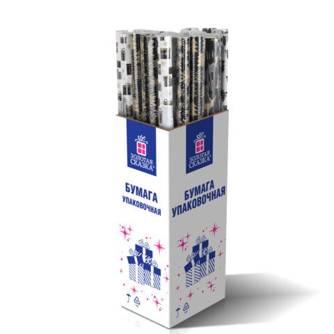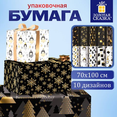 Бумага упаковочная новогодняя "Black.Gold.White", 70х100 см, 10 дизайнов ассорти, ЗОЛОТАЯ СКАЗКА, 592052