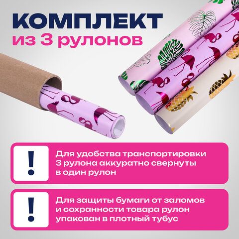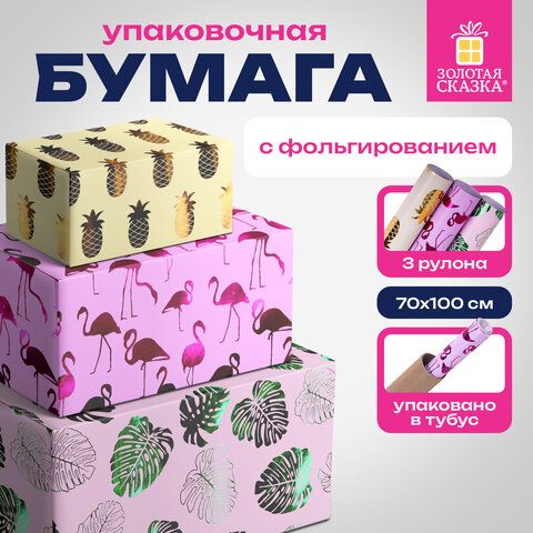 Бумага упаковочная С ЭФФЕКТАМИ НАБОР 3 шт. "Colorful Tropics", 70х100 см, ЗОЛОТАЯ СКАЗКА, 591945