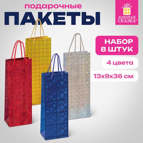 Пакет подарочный для бутылки 36x13x8см (B) НАБОР 8шт, голография, ассорти, ЗОЛОТАЯ СК, 609735