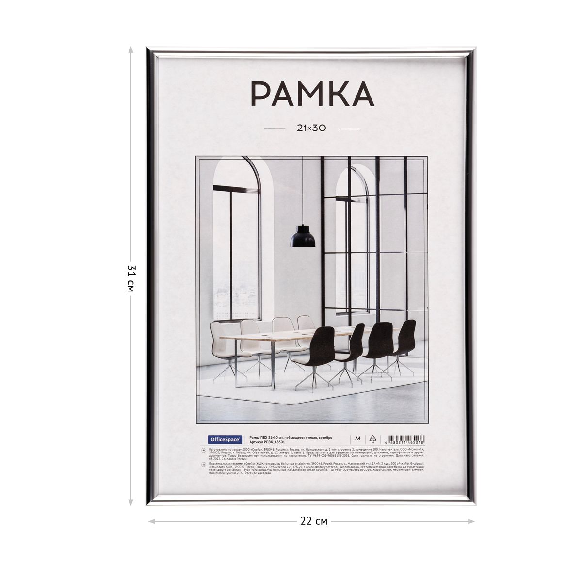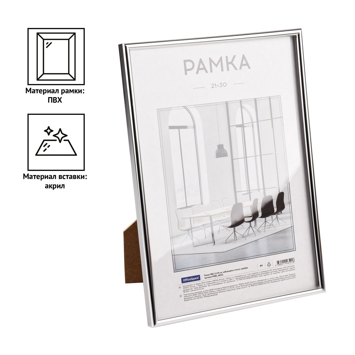 Рамка ПВХ 21*30см, OfficeSpace, небьющееся стекло, серебро