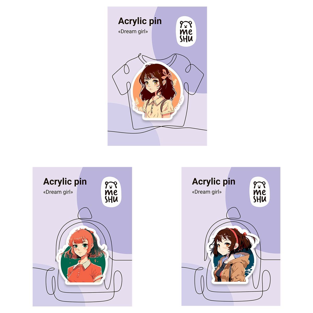 Набор акриловых значков MESHU "Dream girls", прямая УФ-печать, 3шт.