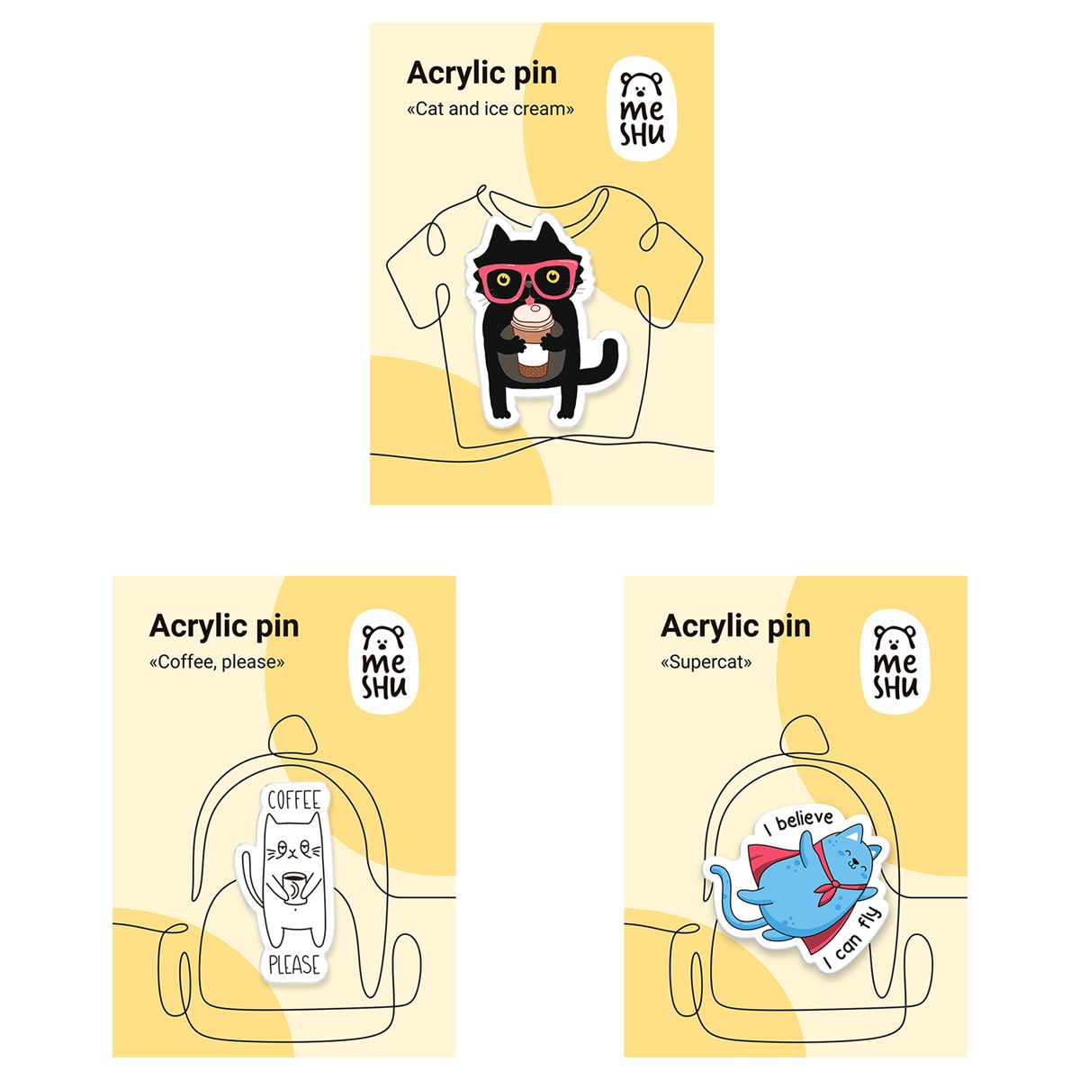 Набор акриловых значков MESHU "Three cats", прямая УФ-печать, 3шт.