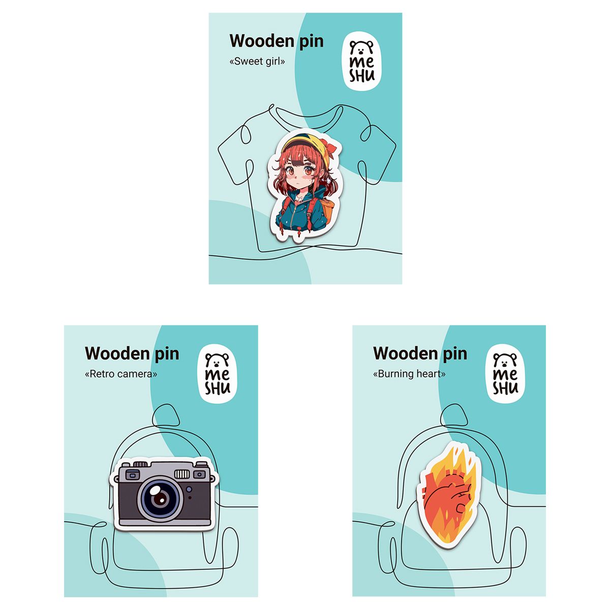 Набор деревянных значков MESHU "Burning heart", каширование, 3шт.