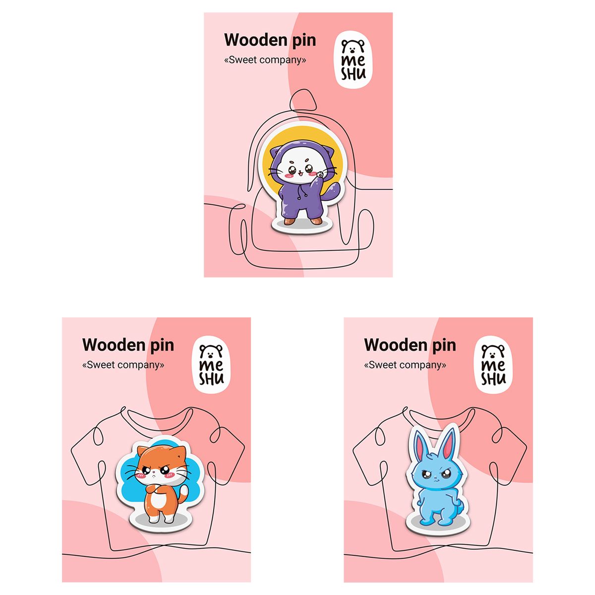 Набор деревянных значков MESHU "Sweet company", каширование, 3шт.