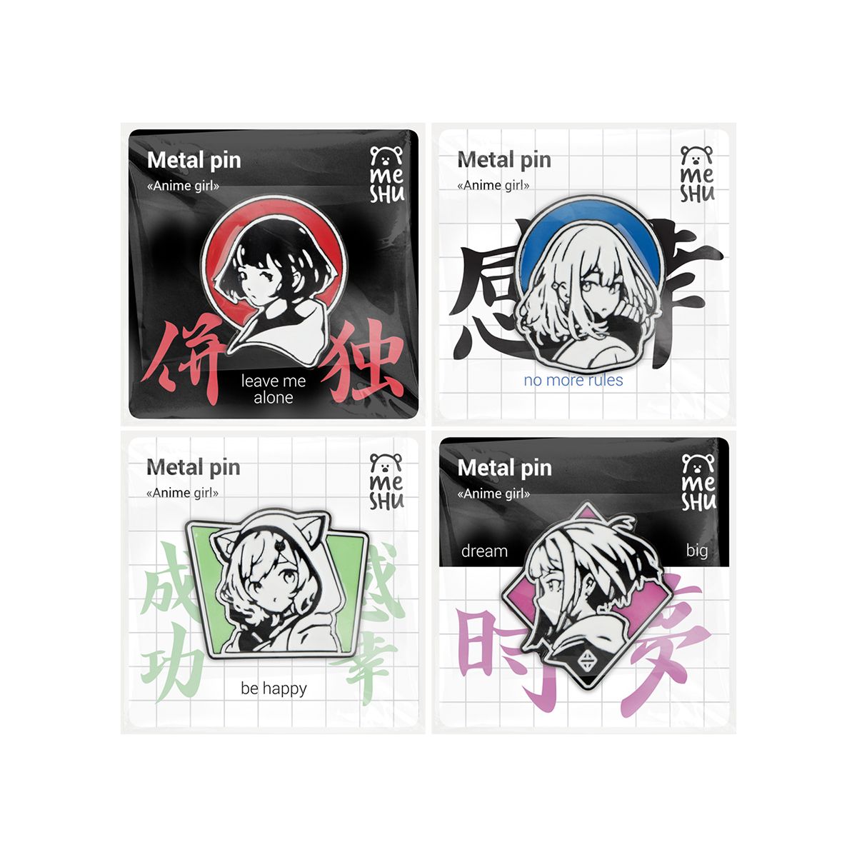 Набор металлических значков MESHU "Anime girls", эмаль, 4шт, картонная подложка, европодвес