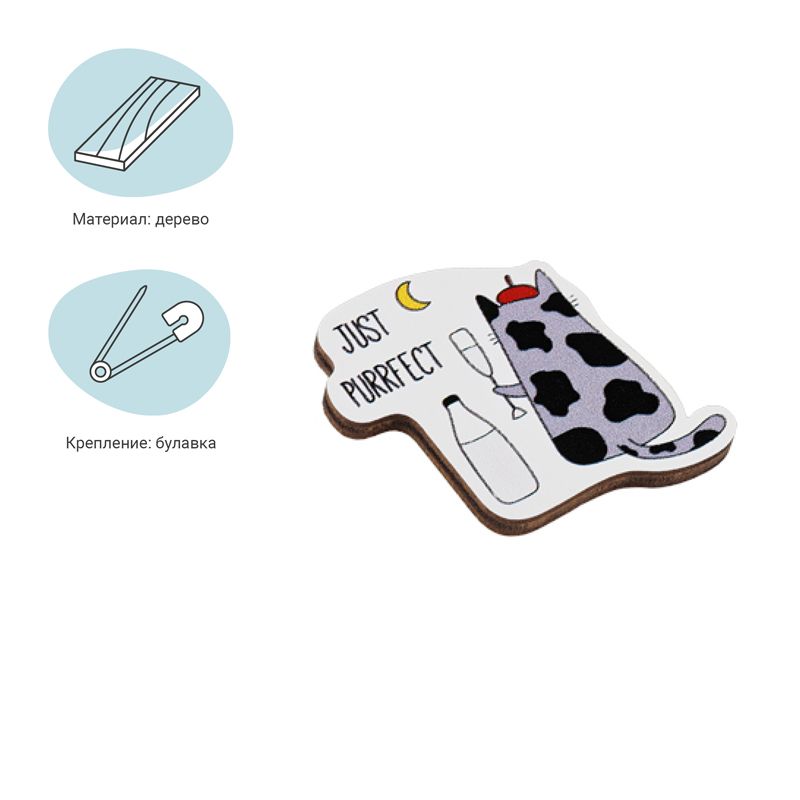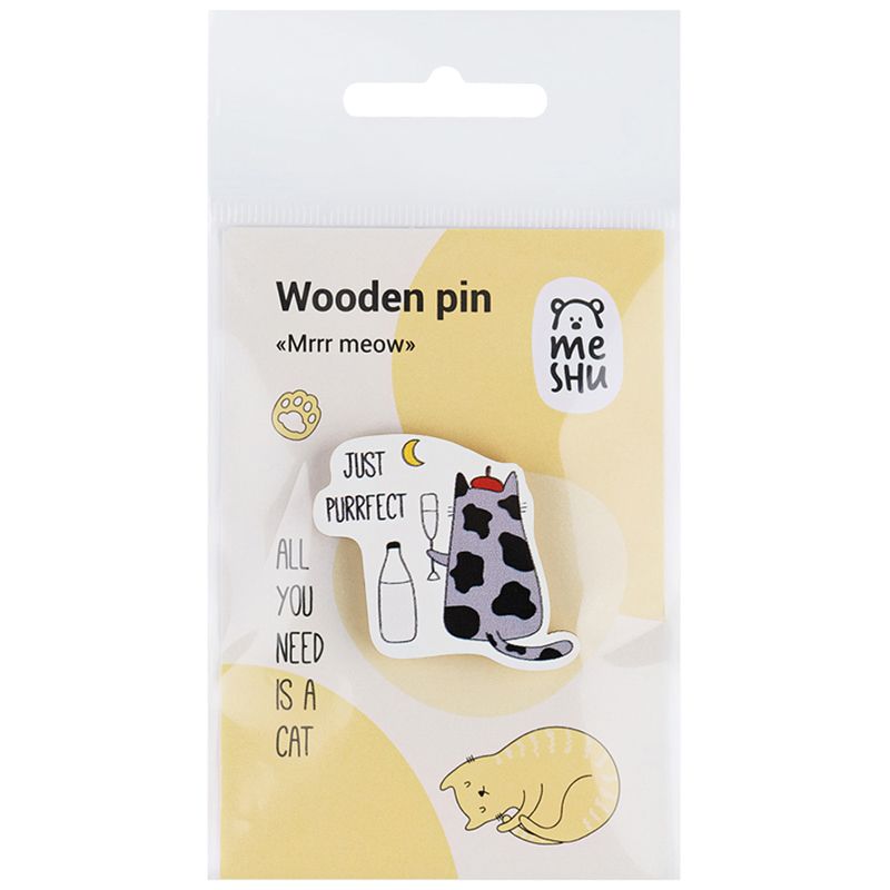 Значок деревянный MESHU "Mrrr meow", прямая УФ-печать, 3,8*3,6см