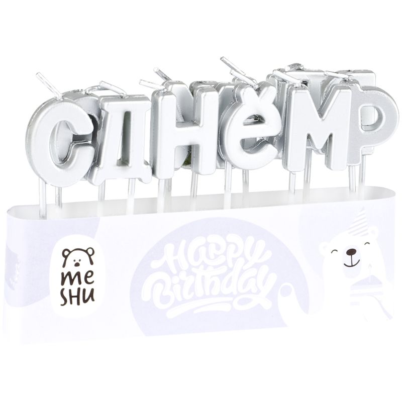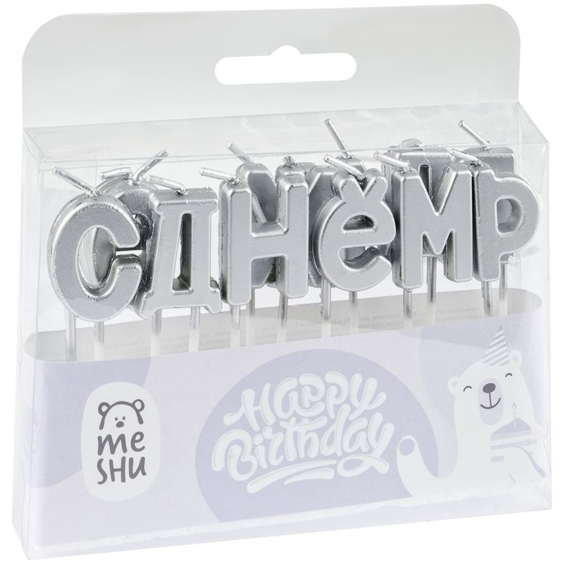 Свечи для торта с держателями MESHU "Буквы. С Днем Рождения", 2,7см, серебряные, 13шт.
