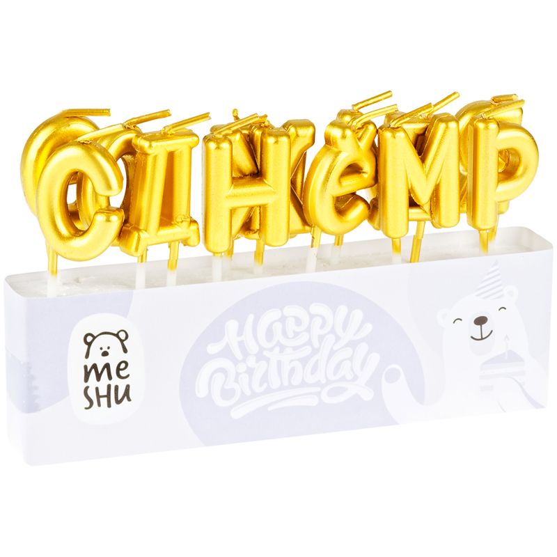Свечи для торта с держателями MESHU "Буквы. С Днем Рождения", 2,7см, золотые, 13шт.