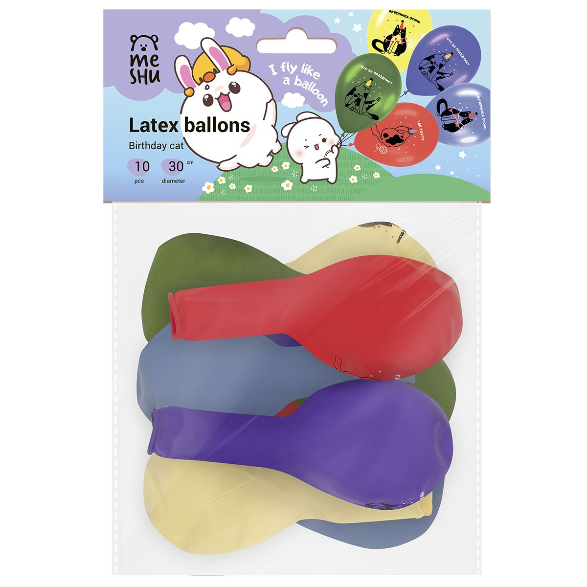 Набор упакован в яркий индивидуальный пакет с европодвесом. Дизайн упаковки с милыми персонажами создаст праздничное настроение. Шарики поставляются в ненадутом виде.