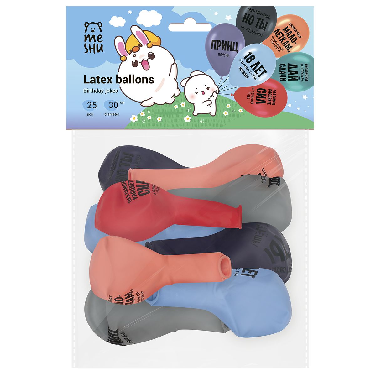 Набор упакован в яркий индивидуальный пакет с европодвесом. Дизайн упаковки с милыми персонажами создаст праздничное настроение. Шарики поставляются в ненадутом виде.