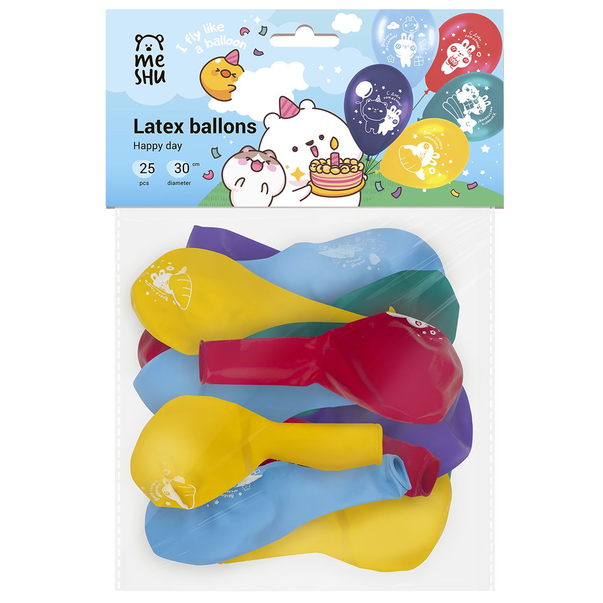 Набор упакован в яркий индивидуальный пакет с европодвесом. Дизайн упаковки с милыми персонажами создаст праздничное настроение. Шарики поставляются в ненадутом виде.