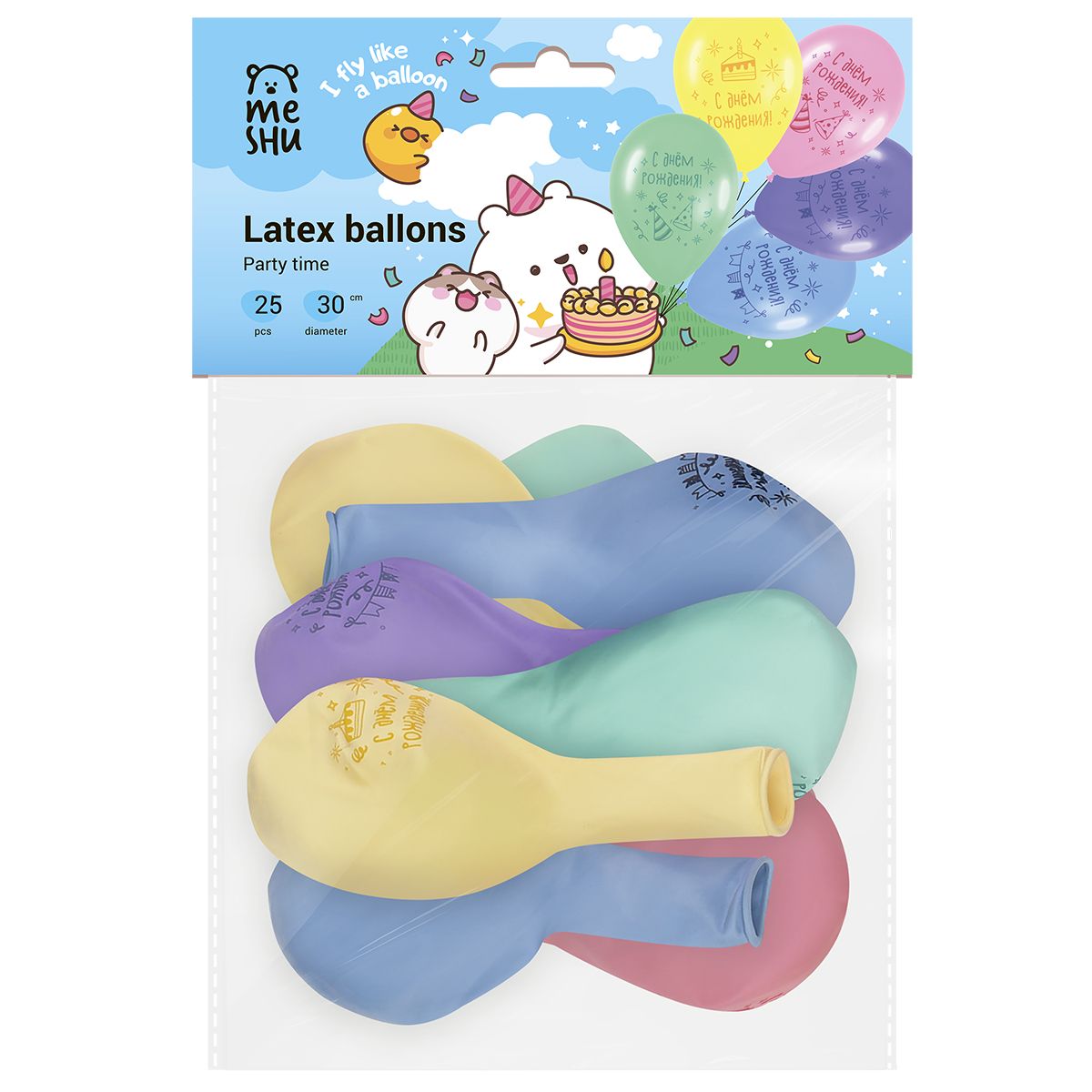 Набор упакован в яркий индивидуальный пакет с европодвесом. Дизайн упаковки с милыми персонажами создаст праздничное настроение. Шарики поставляются в ненадутом виде.
