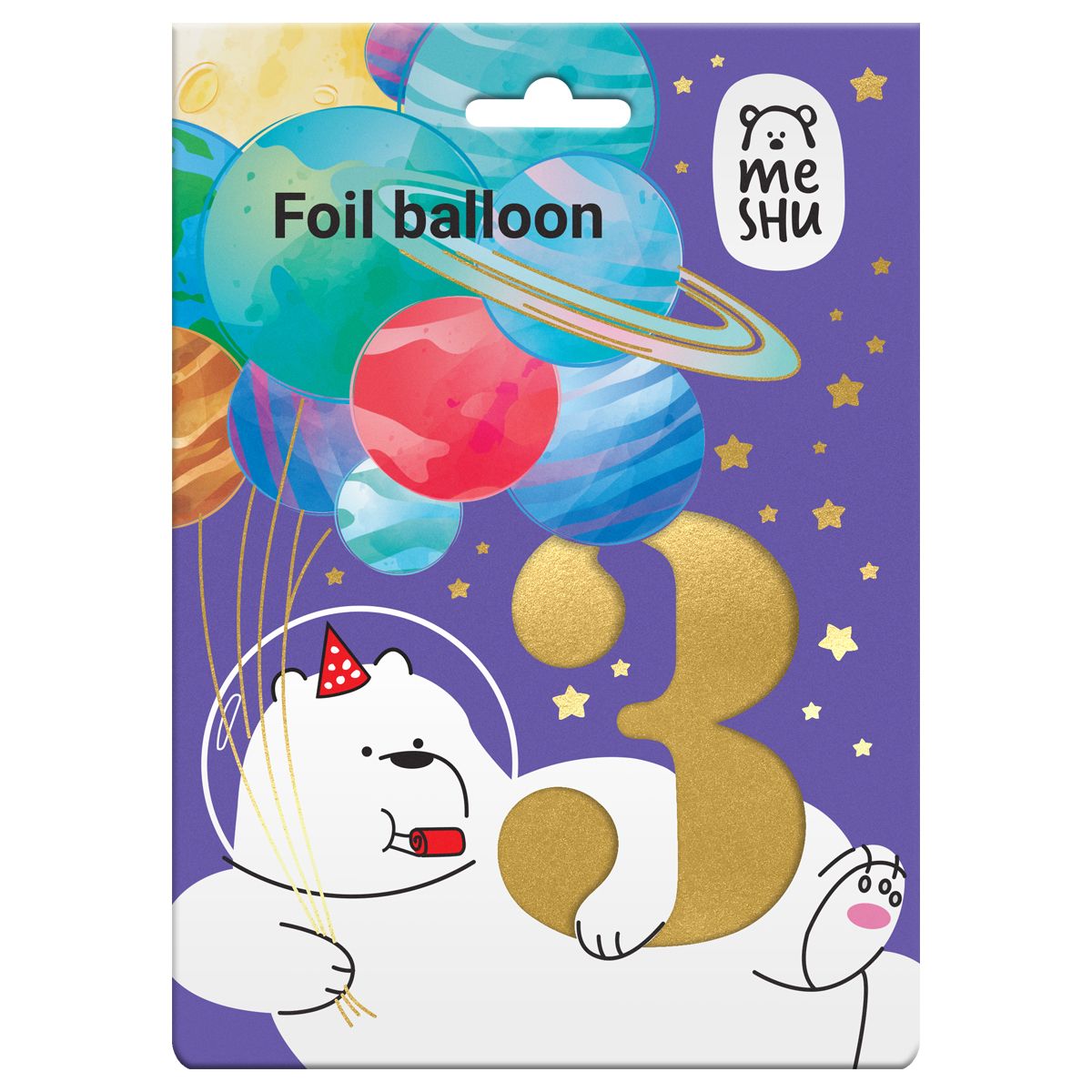 Воздушный шар, 40", MESHU, цифра 3, золотой, фольгированный