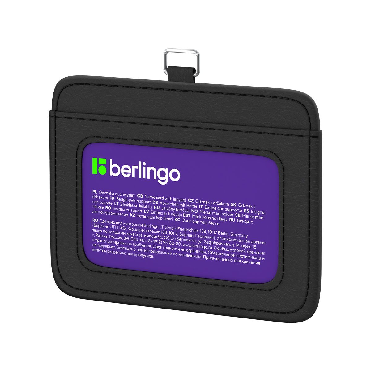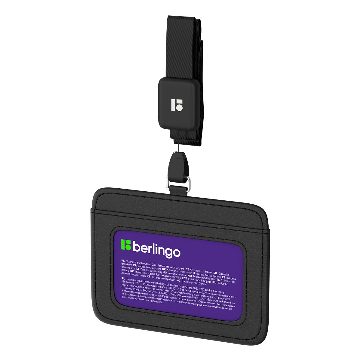 Бейдж горизонтальный Berlingo "ID 500", 85*55мм, экокожа, держатель-рулетка с лентой 45 см, черный
