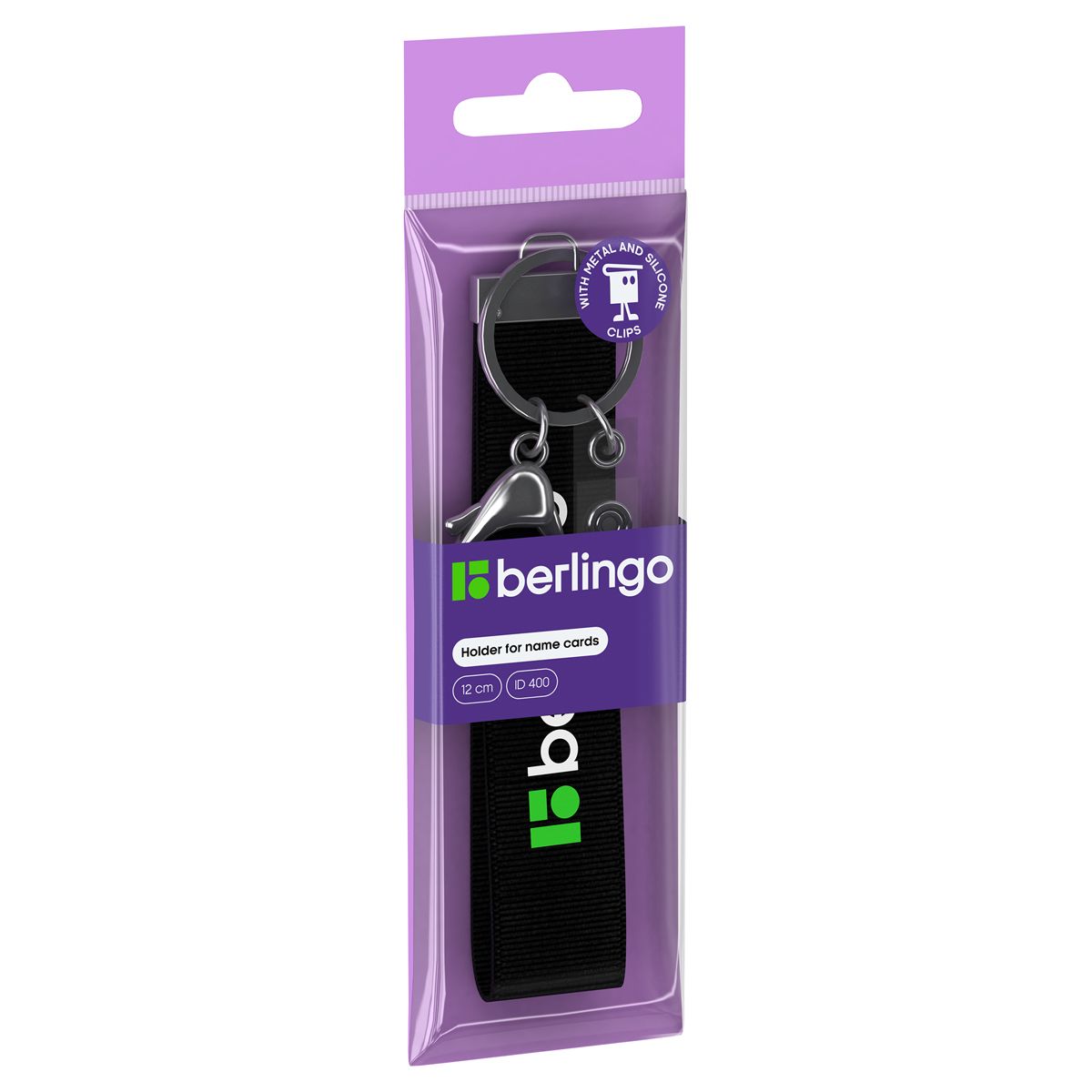 Держатель для бейджей Berlingo "ID 400", текстильный, 12см, с карабином и клипом, черный