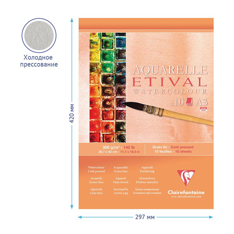 Альбом для акварели, 10л., А3, на склейке Clairefontaine "Etival", 300г/м2, холодное прессование