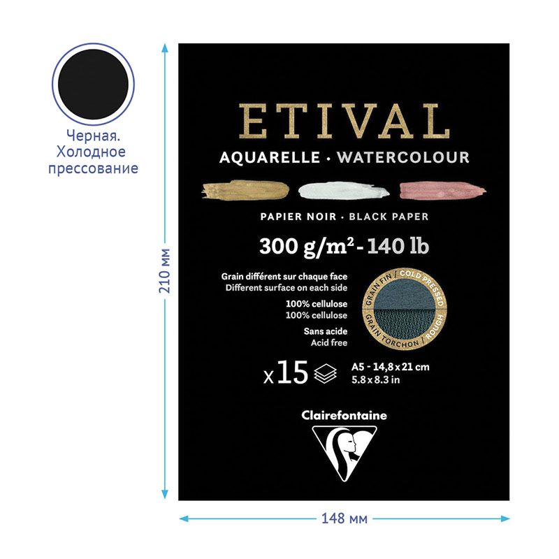 Альбом для акварели, 15л., А5, на склейке Clairefontaine "Etival", 300г/м2, торшон, холод. пресс., черный