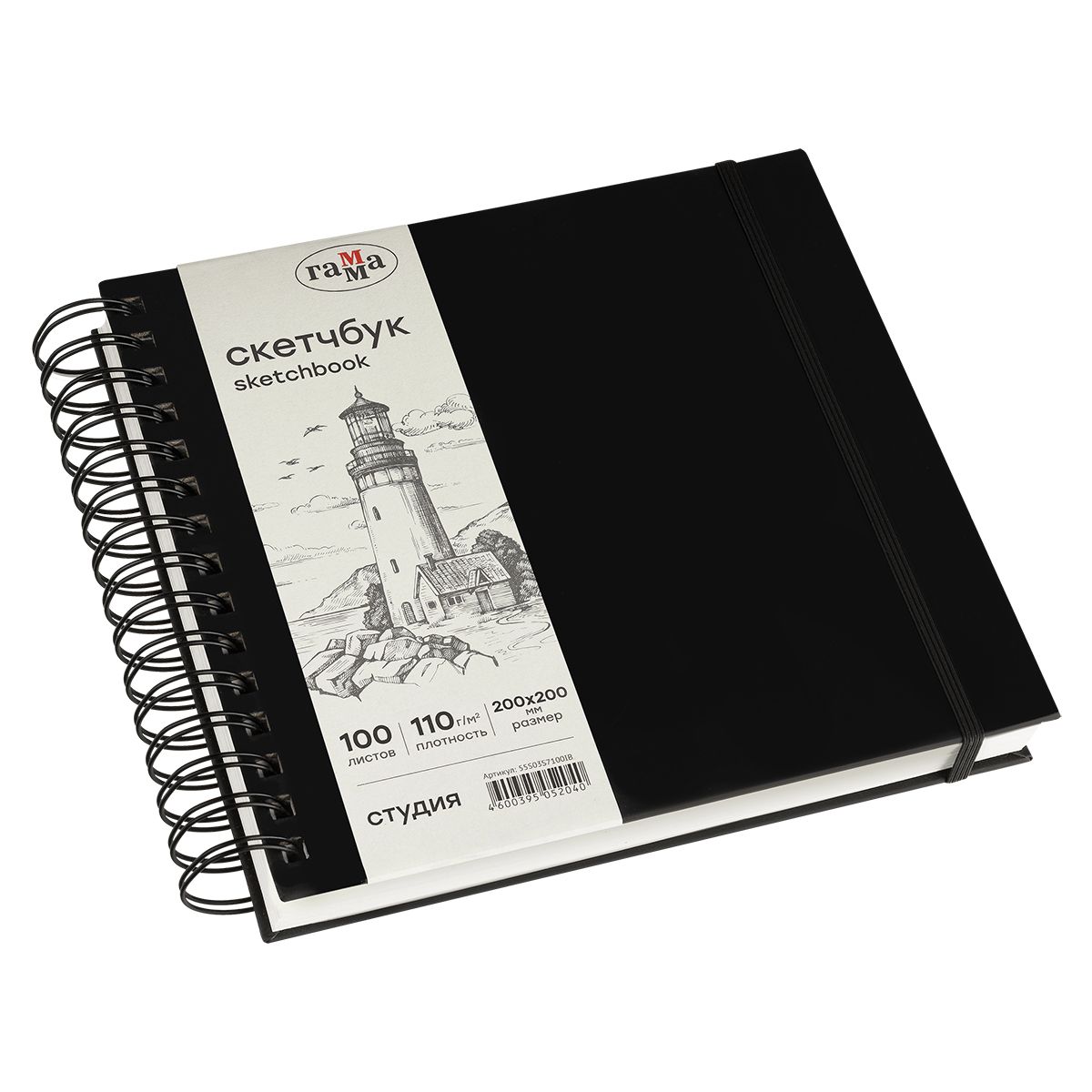 Скетчбук 100л., 200*200 Гамма "Студия", на спирали, черный, твердая обложка, на резинке, слоновая кость, 110г/м2
