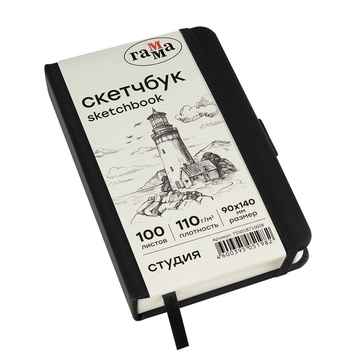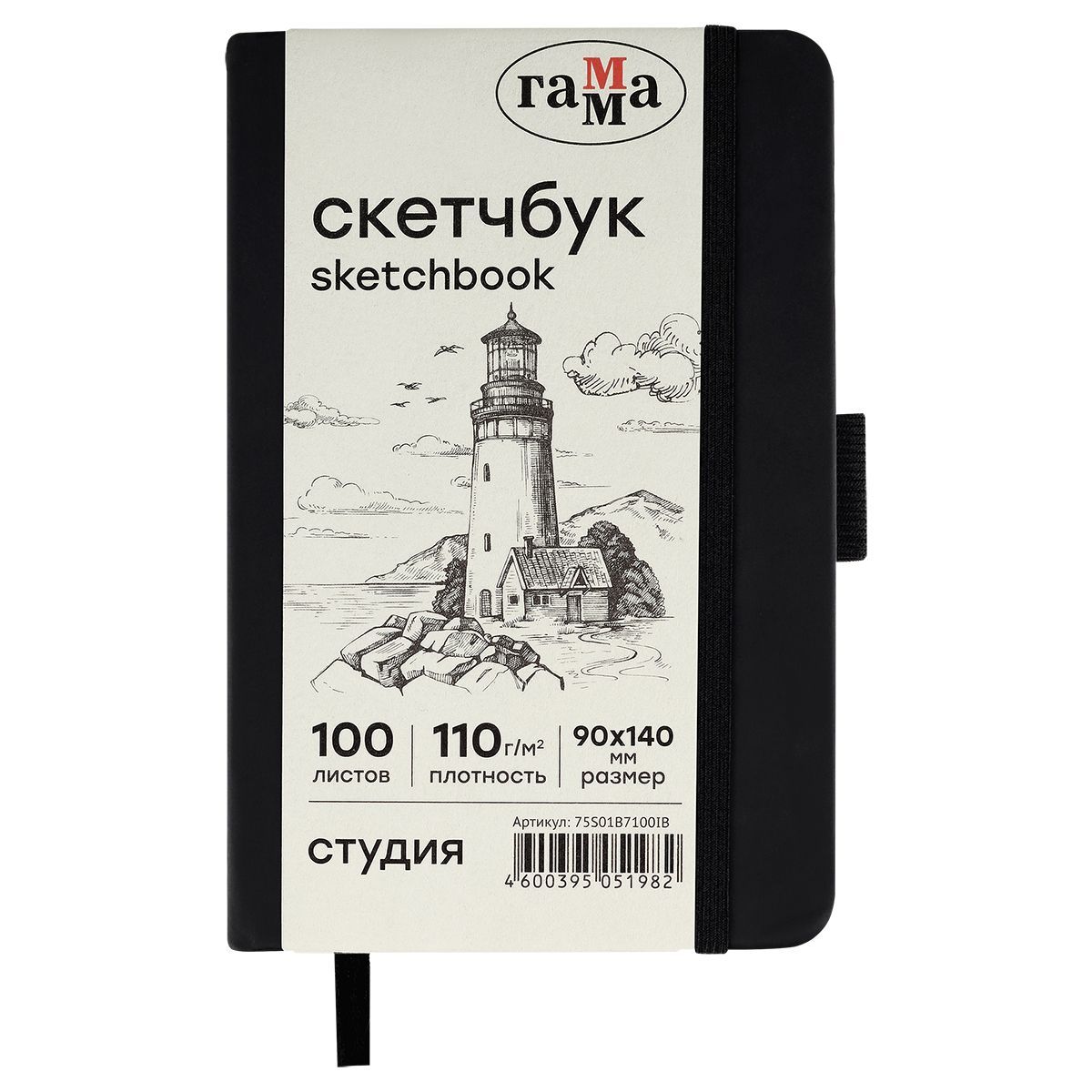 Скетчбук 100л., 90*140 Гамма "Студия", черный, твердая обложка, на резинке, слоновая кость, 110г/м2